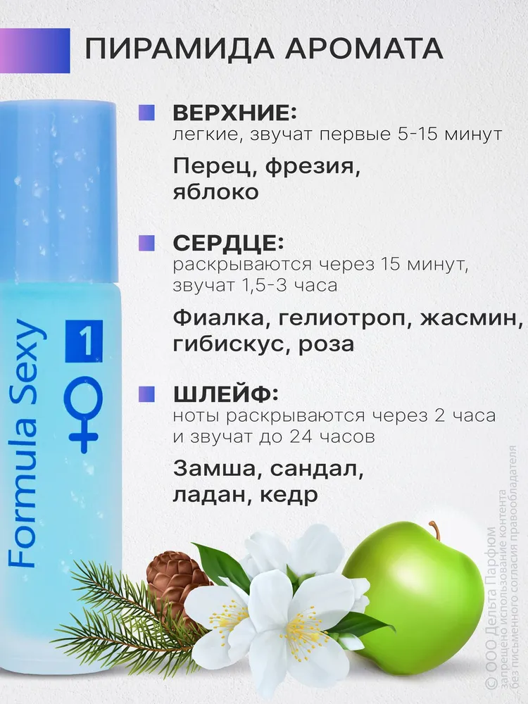 Почувствуйте уверенность и соблазнительность с женскими масляными духами с феромонами Formula Sexy №1. Яркая композиция из пряного перца, сочного яблока и утончённого жасмина подчёркивает женственность и притягивает внимание.